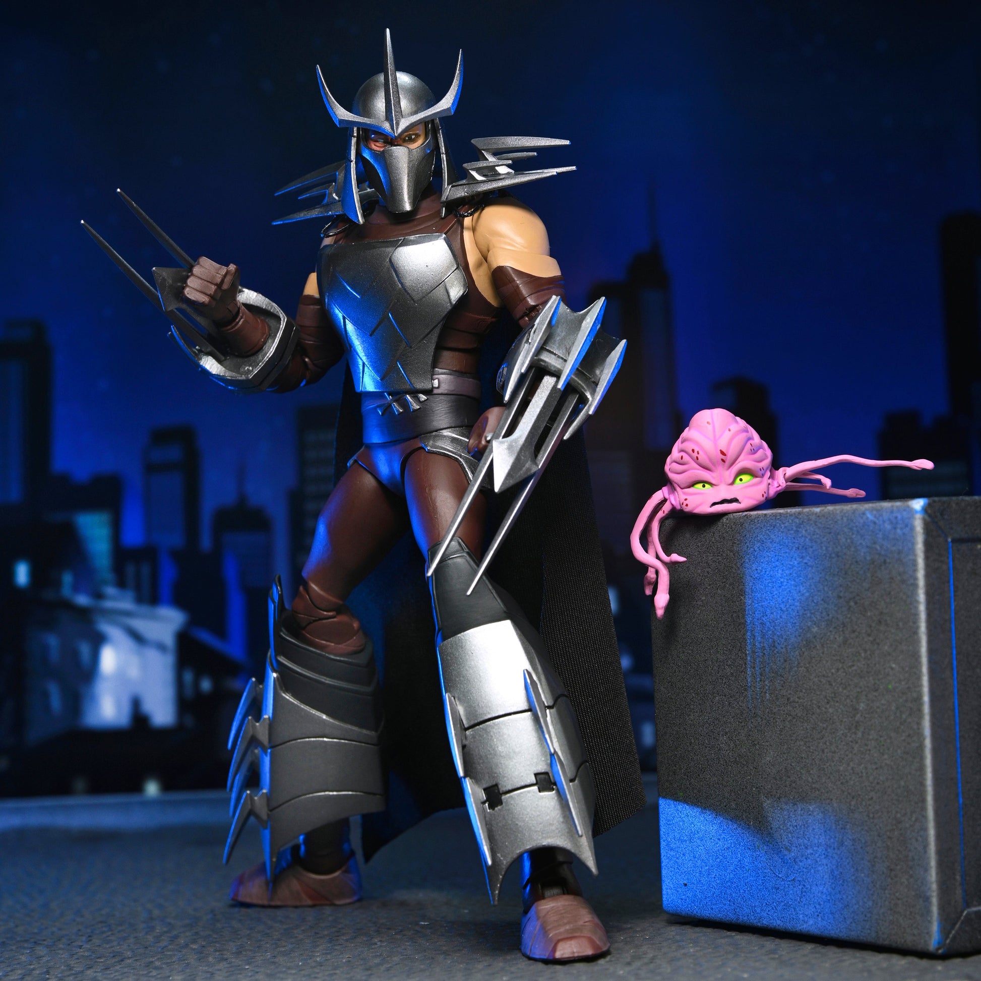 This 7-inch scale Shredder figure captures the ruthless leader of the Foot Clan with incredible painted details to replicate his animated appearance. He includes an array of episode-specific accessories: interchangeable heads and hands, removable arm blades, cloth cape, and Kraang. The figure comes in collector-friendly packaging with illustrations by TMNT artist Ciro Nieli.